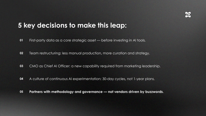First, first-party data must be treated as a core asset. The foundation of any AI strategy is the quality and depth of available data. Without well-structured proprietary data, technology delivers generic and undifferentiated results.