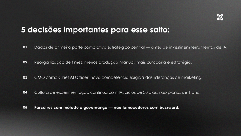 A transição de “experimentar IA” para “operar com IA” exige decisões estruturais. Cinco delas se destacam pela urgência: